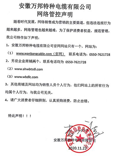 鄭重聲明:安徽萬邦特種電纜有限公司官方網站為:www_wanbangcable_com.lstbd.com,除此之外無任何子網站或合作網站,其余均為假冒偽劣。電話:0550-7621728 13485756353 地 址:安徽省天長市滁州高新技術產業開發區經四路29號